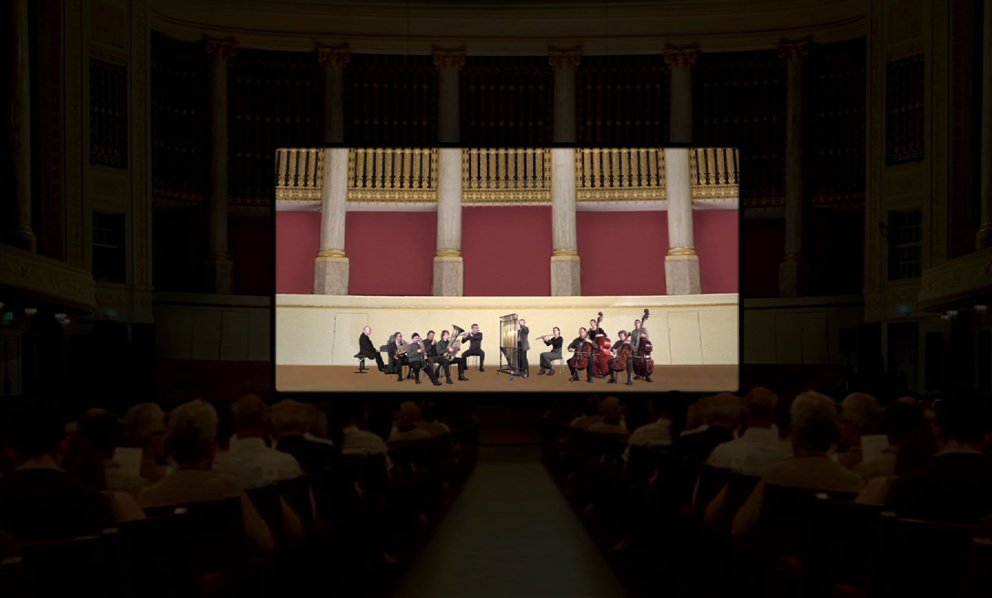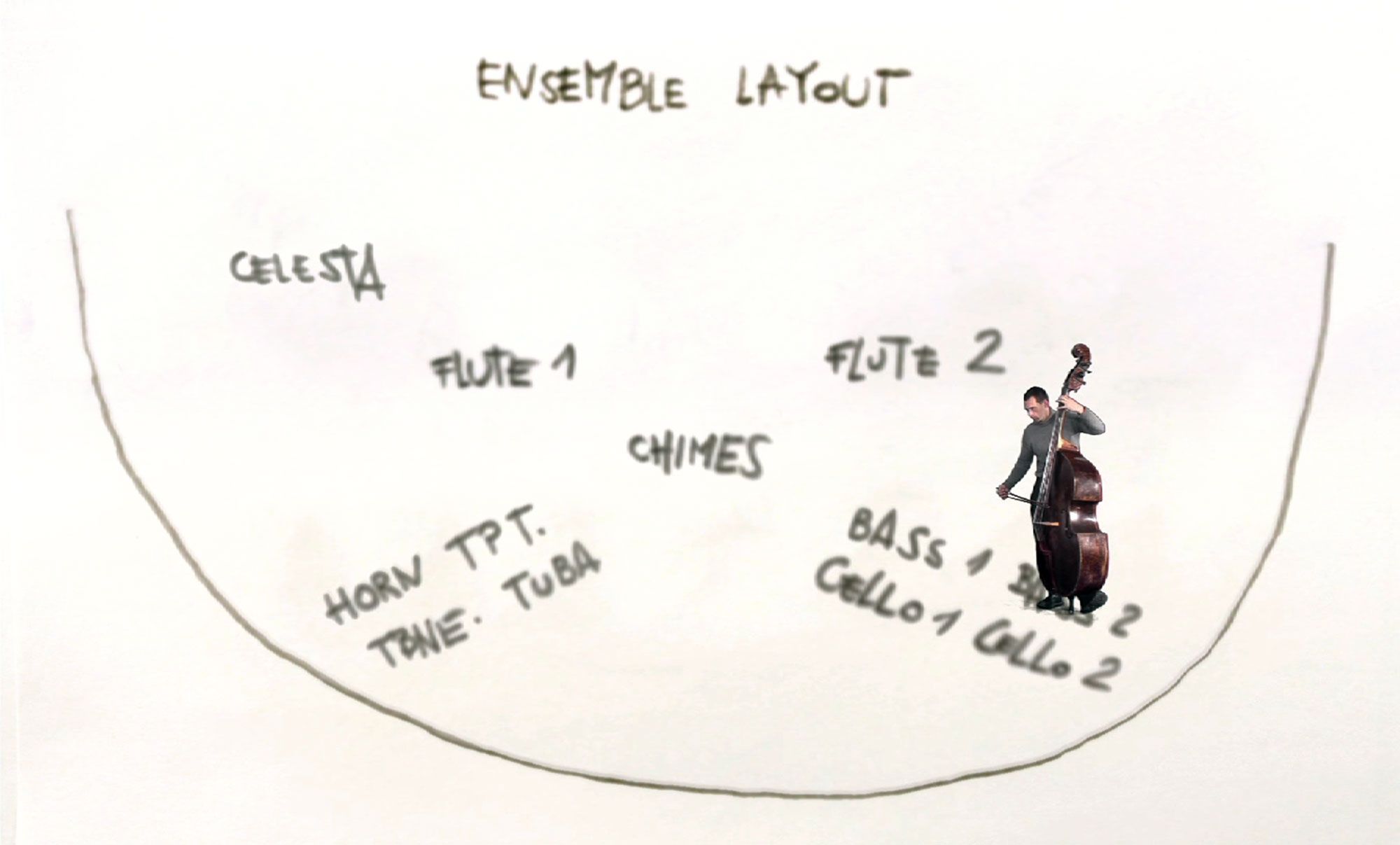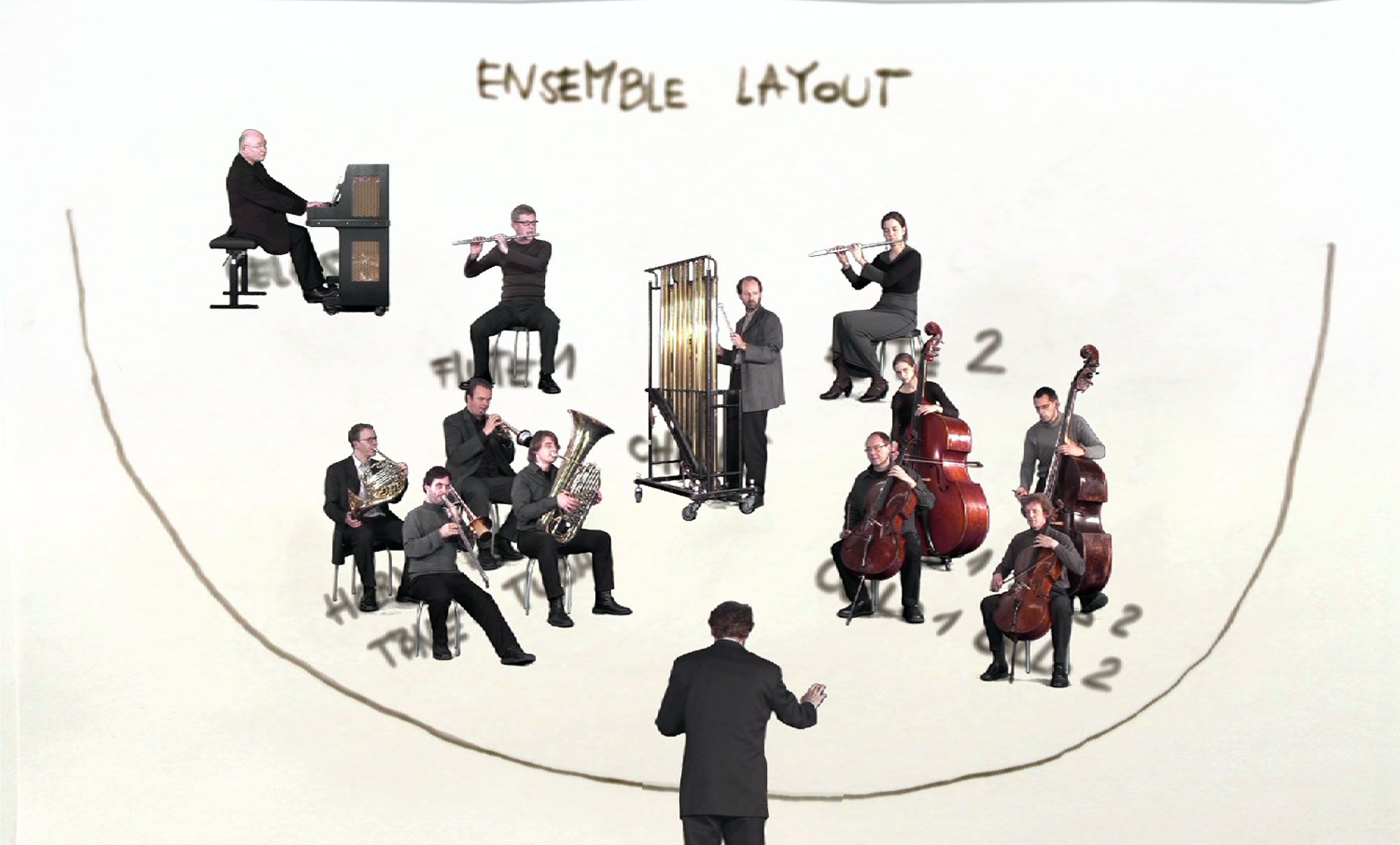 Zu Stimmenraunen, Kritzelgeräuschen, summenden Klangfetzen kurvt die Kamera über eine Materialansammlung, wie sie auf einen Schreibtisch im Schaffensrausch zu gehören scheint. Noten und Notizen, Hefte und Bleistifte, Muster aller Art auf und zwischen Zetteln, nicht geleerte Martinigläser, gefüllte Aschenbecher, Totenköpfe – und da steht auch schon (samt Kaffeetasse!) die Einstellung kopf und eine Ensembleanordnung nach Musikinstrumenten auf dem Papier. Ständig Bewegung, Verwandlung, Variation und wohlige Ungewissheit: Ein Konzertsaal? Ein Kino?